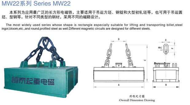 本系列為應(yīng)用最廣泛的長方形電磁鐵,主要適用于吊運方坯,鋼錠和大型初軋坯等,也可適用于吊運圓坯,型鋼等。針對不同類型的鋼材,采用不同的磁路設(shè)計。